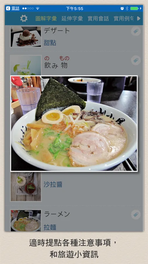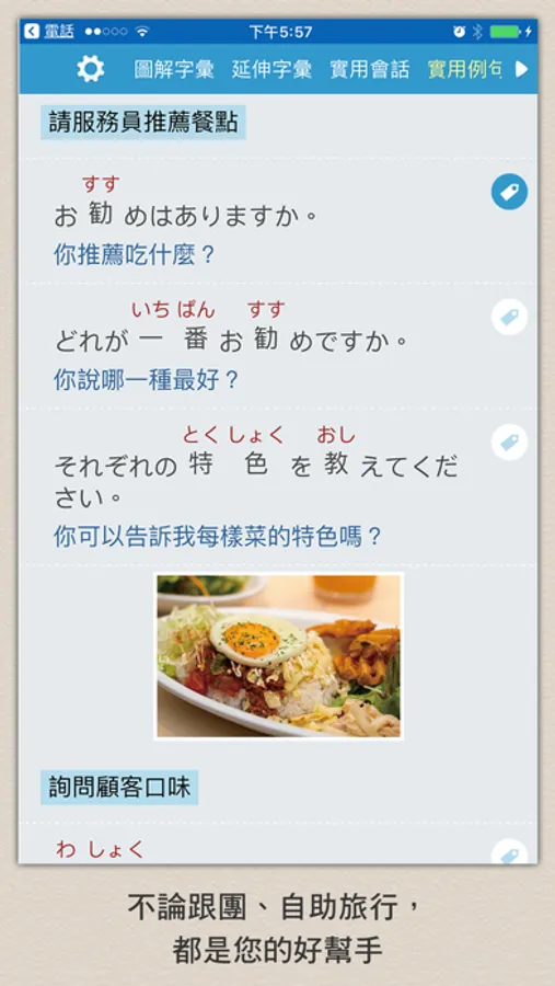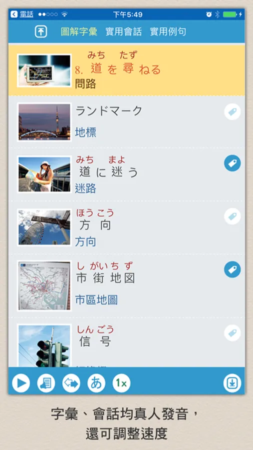 目不暇給的彩圖,搭配實用單字與會話,讓你還沒出國就先認得各種異域事物「長相」,不用再慌忙翻閱旅遊日文書!「百聞不如一見」,這句話不是沒有道理的。本 app 創新採用大量實景照片來介紹字彙和會話,以視覺輔助記憶,不僅學來輕鬆,印象也特別深刻。