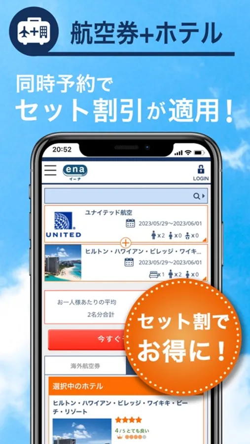 ・航空券+ホテル・セット割:国内でも、海外でも、お好みの航空券とホテルを組み合わせて、セット割でお得に購入いただけます。旅行会社の商品パッケージツアーと違い、自分でお好みの組み合わせをすることができますので、とてもリーズナブル。人気な都市は、東京、大阪、沖縄、札幌、福岡、ソウル、台北、バンコク、香港、シンガポール、上海、ホノルル、グアム、パリ、ロサンゼルスなど。