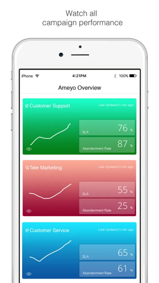 Get a bulls-eye view of your operational metrics of your choice and make key decisions on the go. With Ameyo's Real-Time Supervision App, business leaders can keep track of the customer support metrics with the help of customizable dash board. Dashboard provides a glimpse into the inbound and outbound process KPIs like SLA, Lead Penetration etc. Business heads can enable threshold settings to get notified when the set metrics are breached.