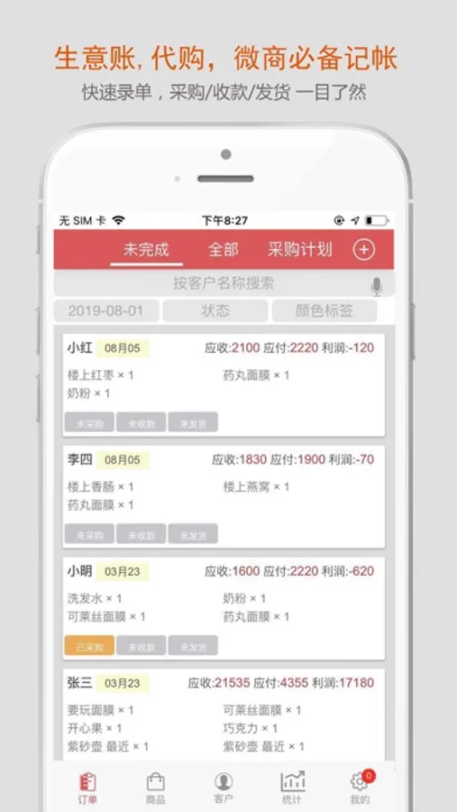 帮你整理订单、采购列表、客户、代理、商品,统计利润,追踪物流。非常适合微商、代购等在微信朋友圈卖东西,以及线下开小店的朋友。