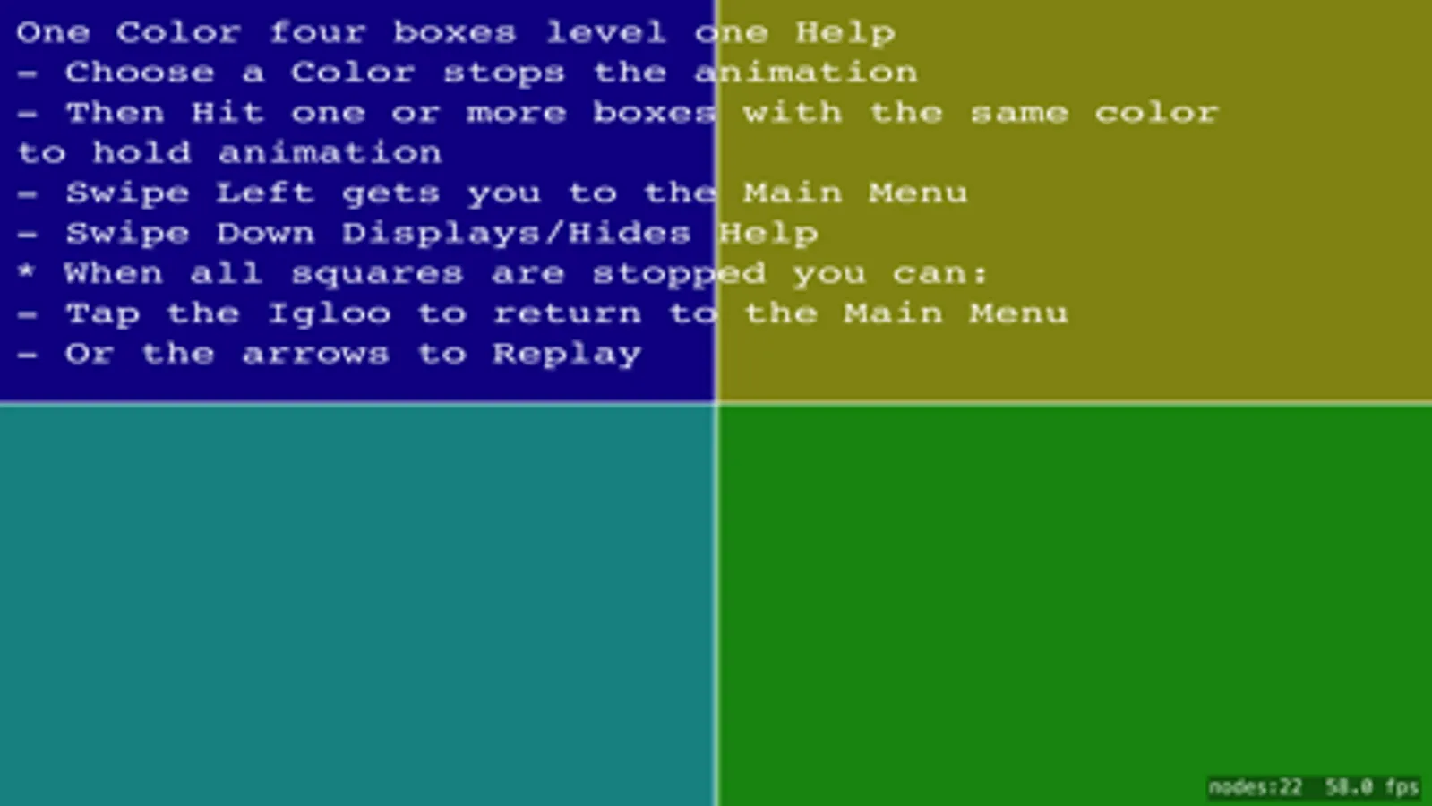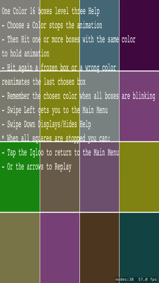 The choice of the right color freezes the box containing it, the play is finished when all the boxes are frozen: in this case the player can replay or return to the main menu.