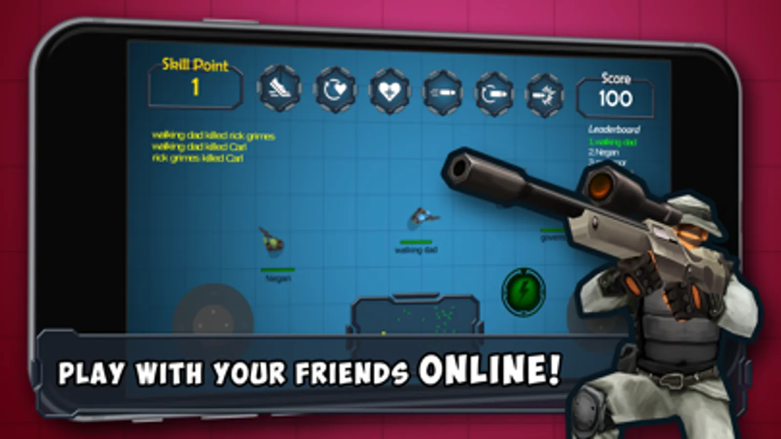 Zombie.io Madness is one of those zombie shooting games with an addictive and fast gameplay that you’ll have hard time turning off! Play alone or choose to host or to join a game! Be precise, increase your skills points and make your own unbeatable high scores! With a global game leaderboard and on-screen dual stick controller, this zombie multiplayer games online io gameplay will definitely glue your hands to your device!