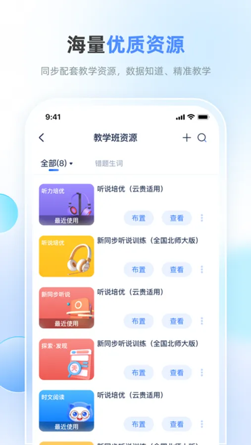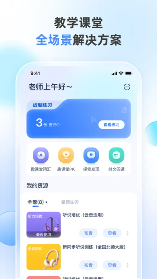适配不同教材,核心功能包括:领读、听写、默写、背诵、配音、讲词、单词PK、拼词PK、查看报告。减轻老师晨读及课堂教学负担,活跃课堂气氛,提升学生英语学习乐趣。