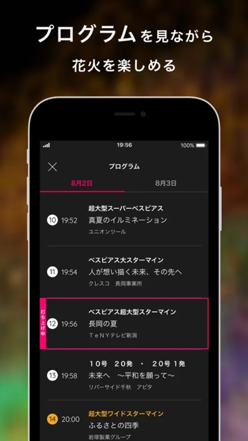 名物「正三尺玉」をはじめ、音楽とシンクロしたストーリー性のある「天地人花火」「花火 この空の花」、全長約2kmにもおよぶ超ワイドスターマイン「フェニックス」など壮大な花火の数々が夜空を彩ります。