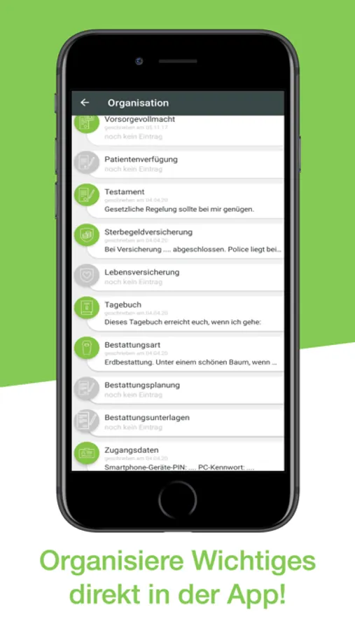 • Dein Lebensbuch erstellen: Deine Lebensziele und -highlights eintragen, dein Tagebuch erstellen und nach deinem Tod an deine Liebsten übermitteln lassen.