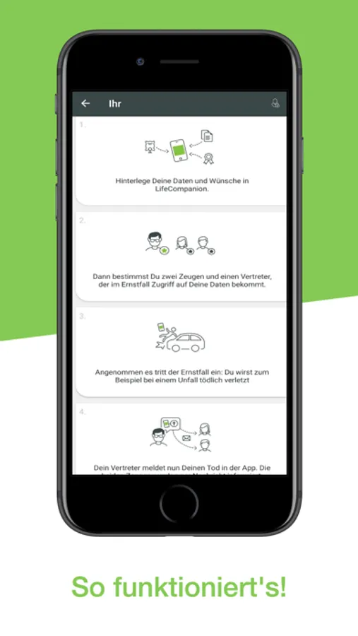 • Patientenwillen übermitteln lassen: Deine Vorsorgeunterlagen besorgen und angeben, welche Du hast und wo Du sie hast, sodass LifeCompanion im Bedarfsfall Deine(n) in der App ernannten Vertreter(n) diese Infos für Dich übermitteln kann.