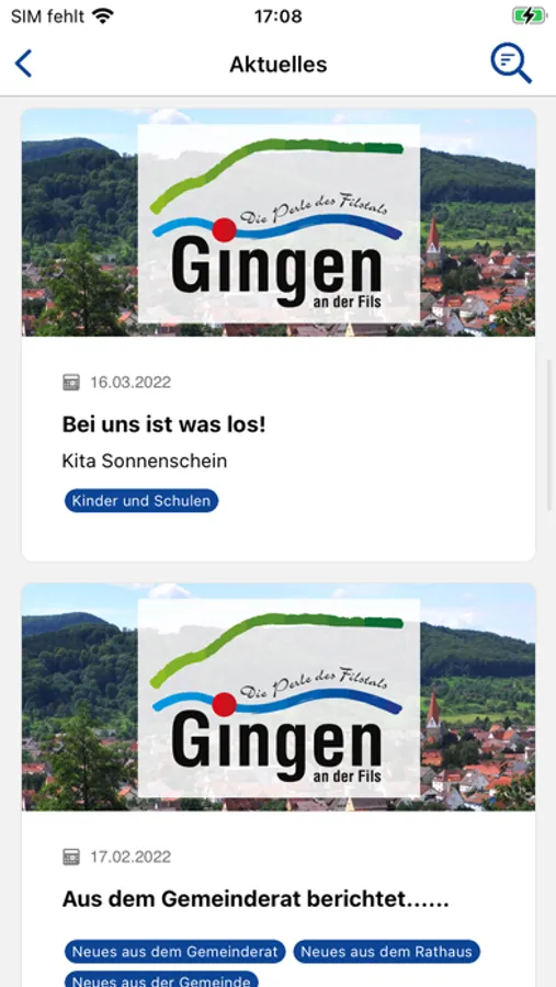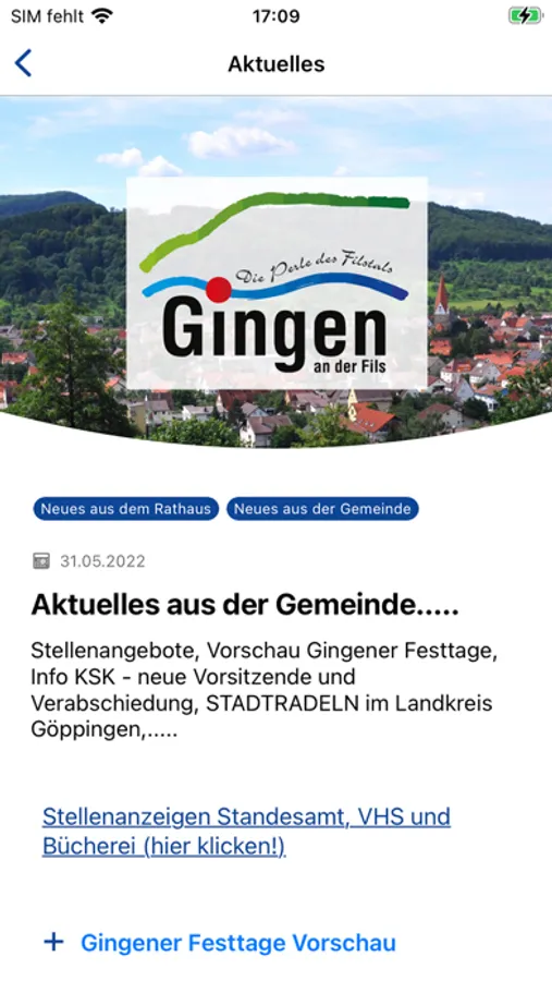 Mit dieser App erhalten Sie einen schnellen und einfachen Zugriff auf aktuelle Meldungen der Gemeinde Gingen an der Fils. Darüber hinaus können Sie sich über Veranstaltungen und andere Termine informieren und diese direkt in Ihren eigenen Kalender übernehmen. Informationen aus dem Rathaus erhalten Sie mittels Push-Nachrichten, deren Empfang Sie über die Auswahl einzelner Kategorien selbst steuern können. Bleiben Sie stets up to date – mit Ihrer Gingen-App.
