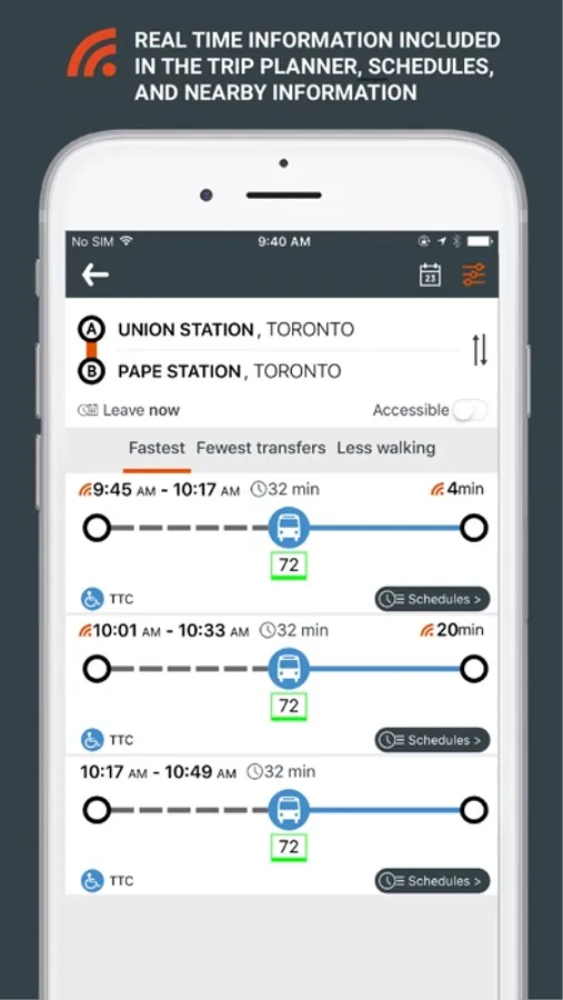 • Real time information included in the trip planner, schedules, and nearby information