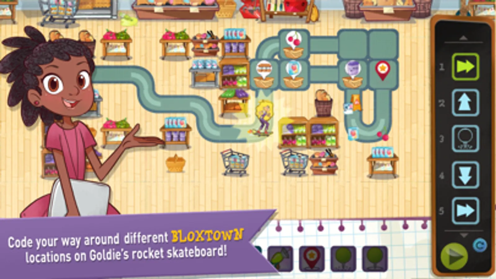 - Zip around 3 locations: grocery store, kitchen, and Bloxtown on Goldie's Rocket Skateboard
