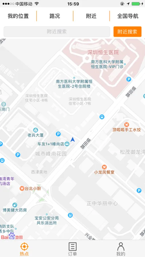 借助百度地图,司机可以很方便的在司机端对订单里的行程进行导航,APP会为司机规划路线;还可以搜索附近地址,方便司机寻找附近的便利店等地址。