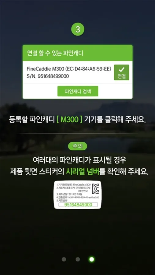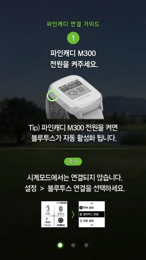 - 파인캐디 앱 열기 > SNS 로그인 > M300 전원 ON > 앱 “연결하기” 클릭 >