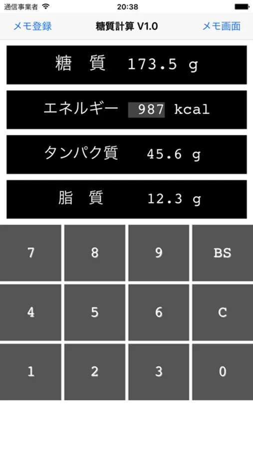 エネルギーとタンパク質と脂質から糖質量を計算する計算機アプリです。一度計算した糖質量を記憶しておくメモ登録機能もあります。糖質制限ダイエットなどに如何でしょうか?