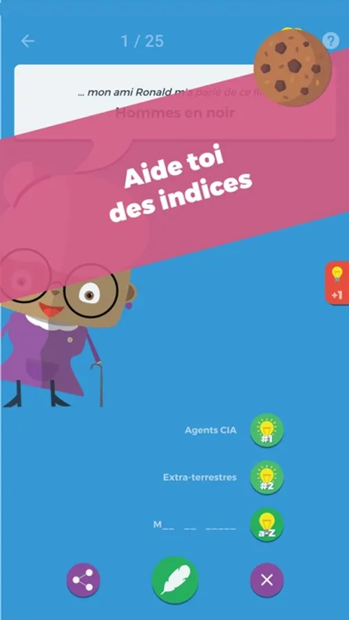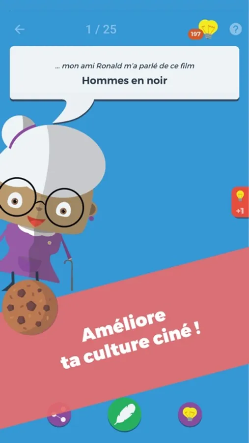 L'application contient une centaine de titres de films à trouver et il y en a pour tous les goûts (film d’action, comédie, drame ...). Lorsque cela devient trop dur, Mamie pourra vous souffler quelques indices.