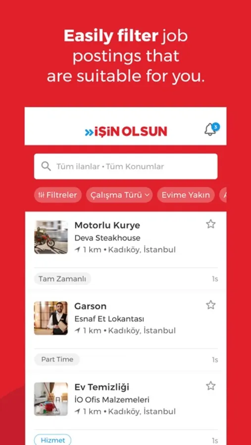 İşin Olsun instantly offers the newest job advertisements for various positions like waiter, secretary, cleaning staff, chef, security guard, courier, motorcycle courier, store staff, cargo personnel, driver, cashier, salesperson, technician, in restaurants, offices, business centers, restaurants, shopping malls, stores, markets, industrial centers, factories, and many other places.