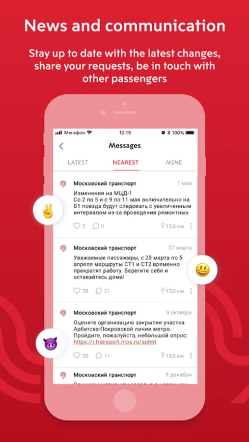 The application shows in real time when the bus, electric bus or tram arrives at the stop. In addition, Moscow Transport news contains information about changing the traffic plan or bus route.