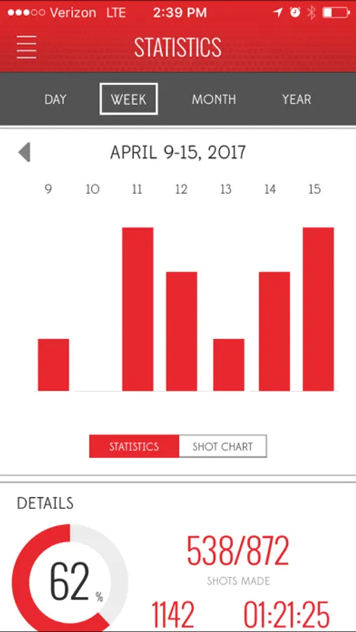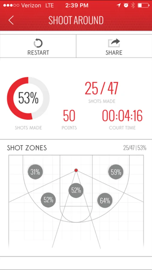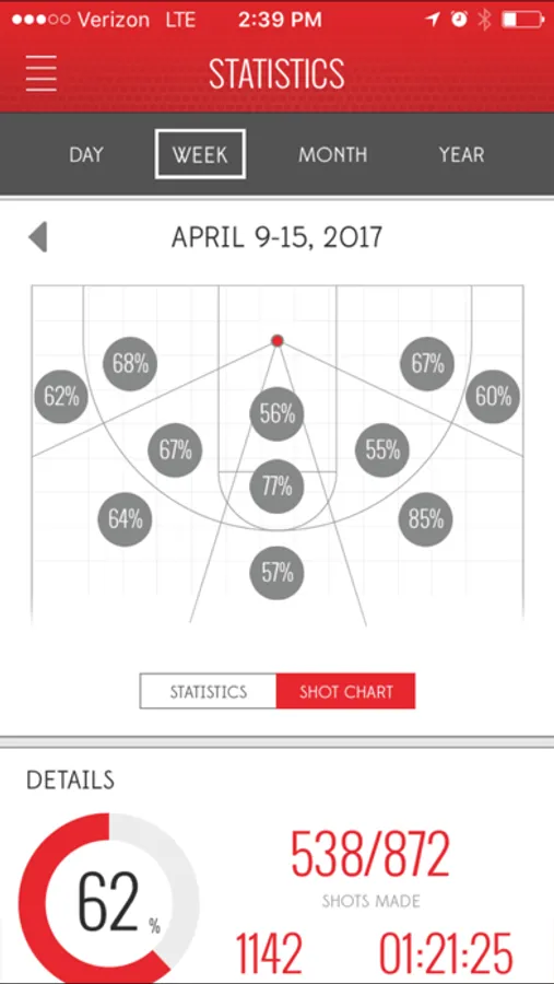 Provide real-time shooting statistics: Review all of your workouts by day, month, year or overall career. See your shooting percentages, points, court time and personal shot map.