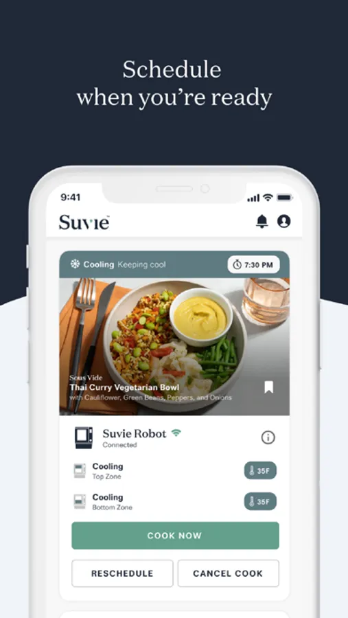 Suvie intelligently refrigerates and cooks your meal using multiple zones, giving you an easy hands-free cooking experience. Enter your mealtime whenever you’re ready, and Suvie does the rest. Get notified when your cook finishes so you can enjoy your Suvie cooked meal right away.