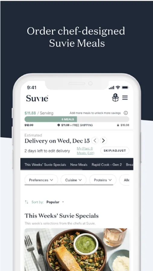 Suvie Meals save you even more time with flexible meal plans delivered directly to your door. Just scan, load, and let Suvie handle the rest. Explore our most popular meals in app- Use our meal planner to mix and match your perfect combination of meals from our weekly menu.