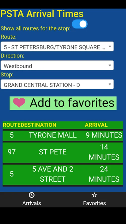 Simply select a route, direction and stop to see the next bus arrivals. Save your favorite stops to see upcoming arrivals with a single touch.