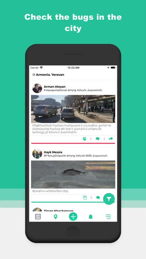 Social media should be used to raise awareness of the issue. Share the bug in social networks, to engage people who are just as concerned as you: neighbors, friends, other residents. Everybody involved can register with the system and support you by supporting, commenting or sharing the bug. Relevant state authorities can also take part in discussions by making comments. All the data about bugs are provided to responsible bodies in a systematic manner, after which processing begins.