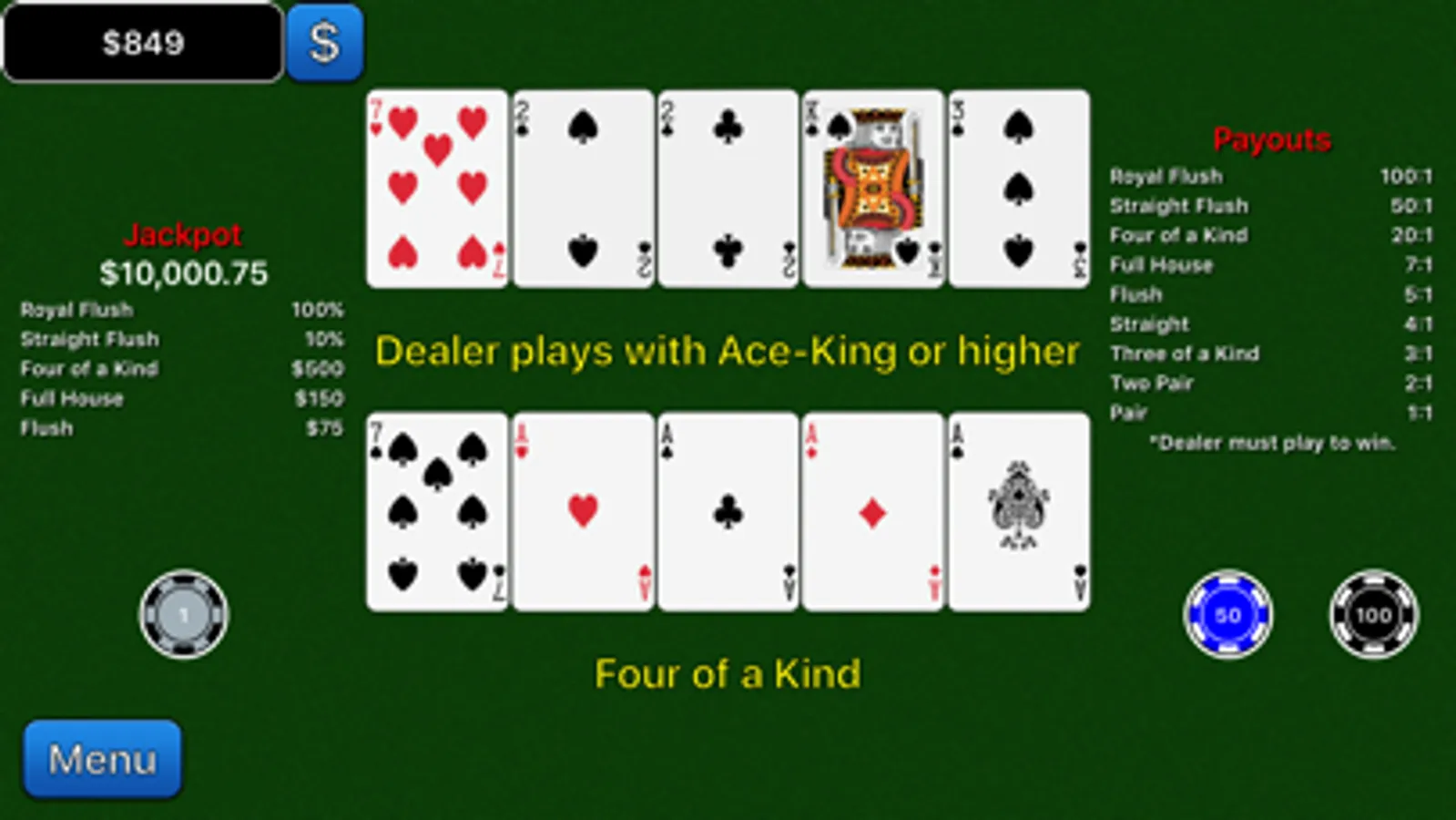 This five card stud variant from the islands is sure to keep you entertained for hours. Pitting you against the dealer, your hand is dealt. You get to see one of the dealers cards before deciding if you want to play. It's that simple.