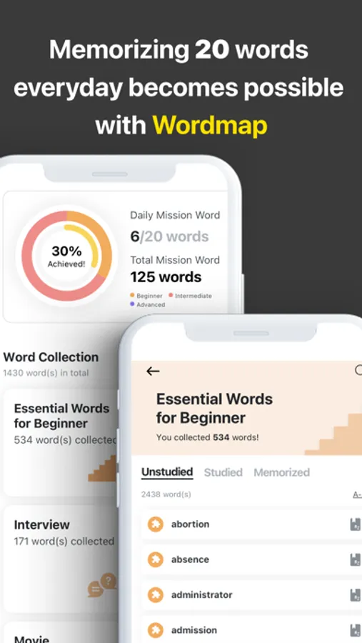 Solve the listening quizzes, study mission words and collect them in your Word Map. Have fun studying and collecting vocabulary for your Word Map! See your Word Map fill up with words and stay motivated~ Study how words you've collected in the Word Map are used in actual expressions. You don't need to look up for examples, review vocabulary using the Word Map!