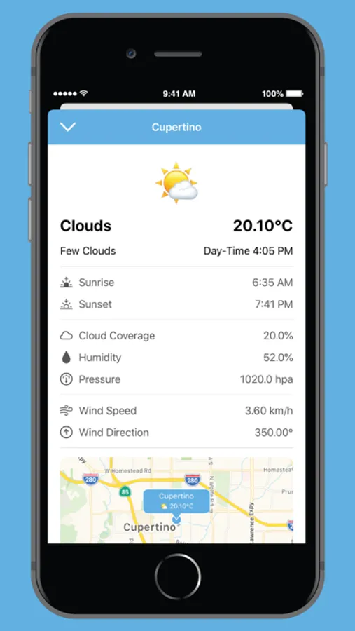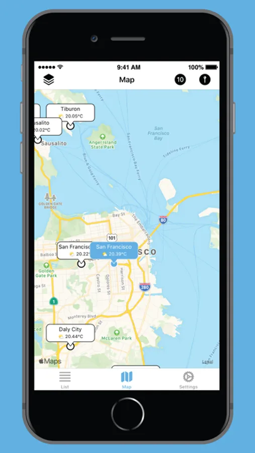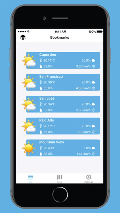 - See current weather information for bookmarked locations and nearby places via a list and a map view