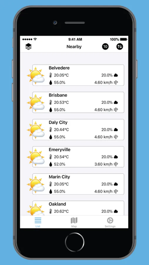 NearbyWeather is a simple weather app, that provides current weather information for nearby places, as well for bookmarked locations. NearbyWeather uses the OpenWeatherMap api to download weather data. Additionally the OpenWeatherMap's location database is directly bootstrapped into the app for quick access.