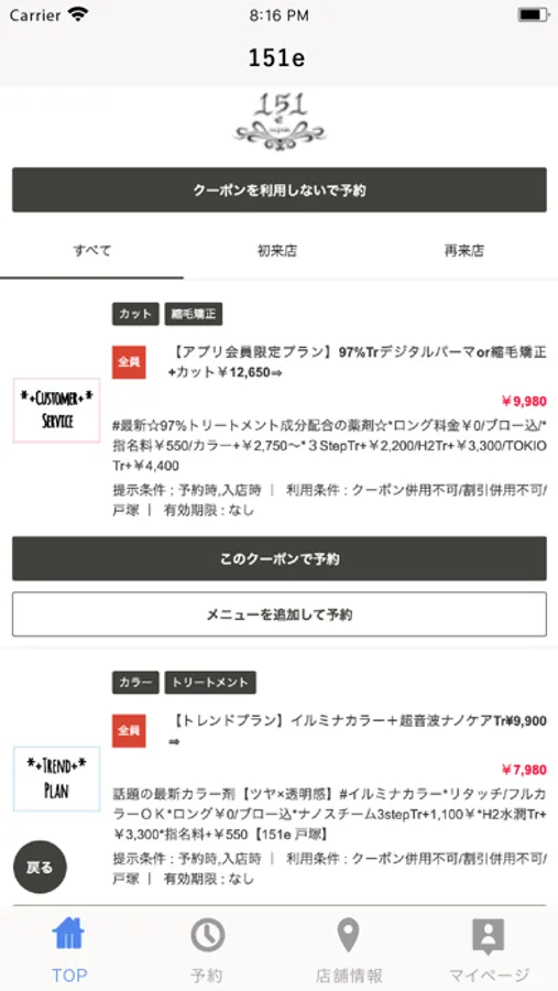 お得なクーポンが配信されます。ネット予約時にクーポン利用での予約も可能なので来店時もスムーズに施術頂けます。