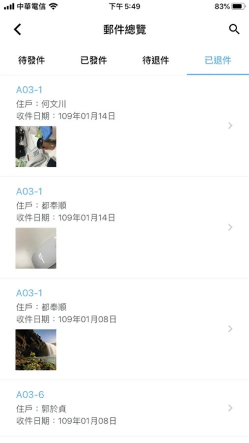 • 信件包裹到達管理中心即時通知社區住戶,住戶即可透過 App 住戶條碼至管理中心領信,收發信件快速又方便。