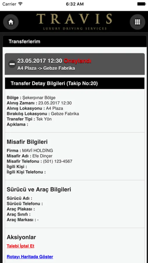 - Transferinize ait şoför ve araç bilgilerini görebilirsiniz.