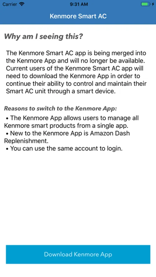 The Kenmore Smart AC app is being merged into the Kenmore App and will no longer be available. Current users of the Kenmore Smart AC app will need to download the Kenmore App in order to continue their ability to control and maintain their Smart AC unit through a smart device.