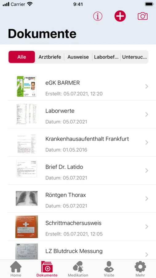 - Dokumentation aller Arztbriefe, Laborwerte und technische Untersuchungsbefunde per Fotoscan