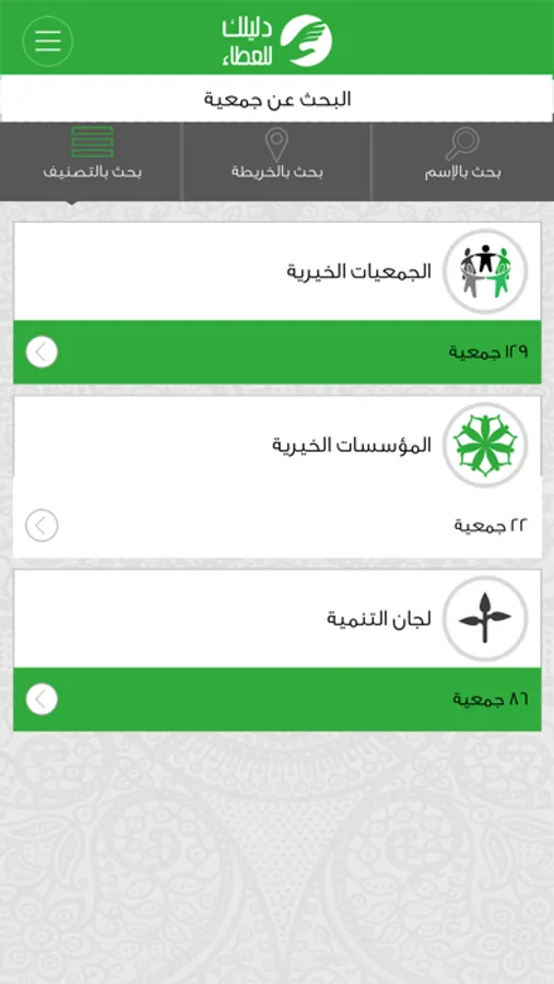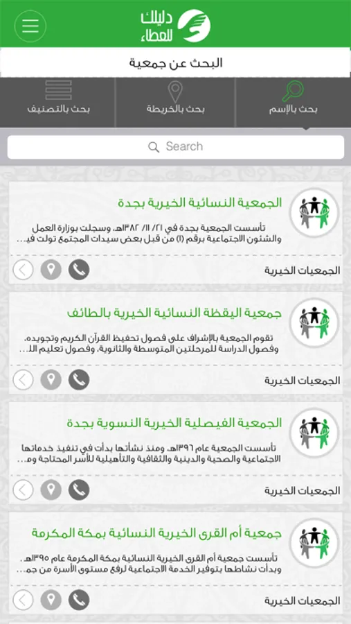 كما يمكن البحث عن الجهات الخيرية حسب النوع والتصنيف.