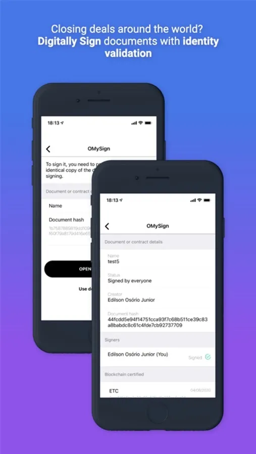 You create your OMyPass to access websites and platforms without the need of registering or filling out forms, and also to sign and authorise transactions. You can digitally sign contracts and digital documents from anywhere in the world using our OMySign solution!