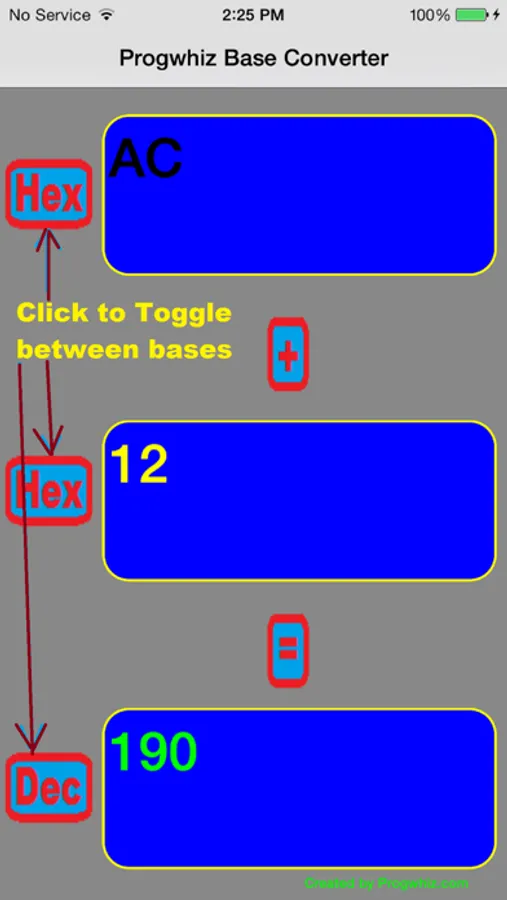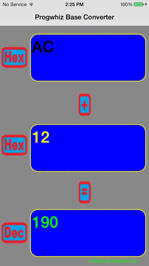 Progwhiz Base Calculator is a powerful yet extremely simple user friendly base computation utility. It allows you to execute Addition and Subtraction of any Hex, Decimal, Binary or Octal numbers and give the result in any of those Bases. You can mix and match different bases or at the click of a button change the represented value in any of the four(4) bases. It's that simple!