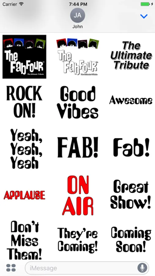Over fifty FAB stickers to tell your friends and fellow fans about "The Fab Four" - The Ultimate Beatles tribute band in the States. They look, act, talk, play, and sing like the original Fab Four. There's even psychedelic animated stickers, slang from the sixties, and album covers from their Christmas album.