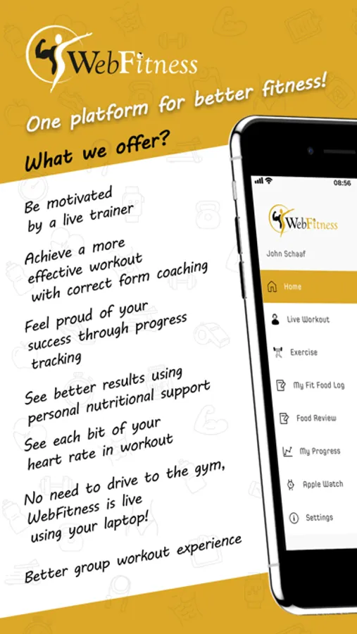WebFitness is an interactive face to face online workout using your webcam laptop. With the app you can schedule workouts, stream workout of the day, view how-to explanations for 100s of exercises, nutritional guidance, and track your progress using the weight tracking with progress pictures.