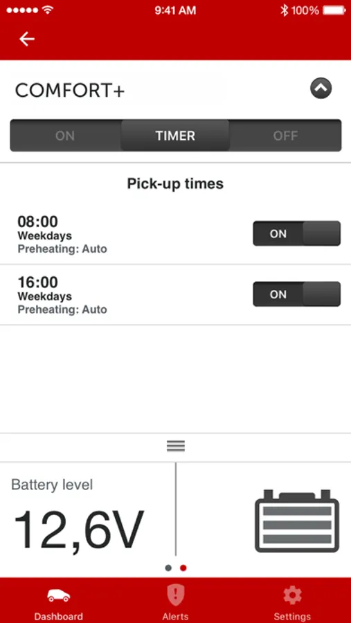 Turn engine and interior heater ON and OFF directly or by a timer. In timer mode, the system will automatically start pre-heating depending on the outside temperature or according to fixed pre-heating times. You can also monitor the outside temperature, the battery voltage of the vehicle and whether the 120V mains cable is connected or not.