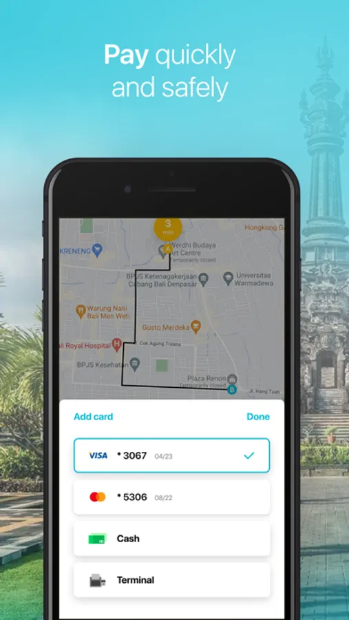 BaliCab provides safe and convenient transport in Bali. Each time you grab taxi ride, city tour or airport transfer, you can review driver’s name and car information before you start a trip. We take care of your safe and comfortable travel experience.
