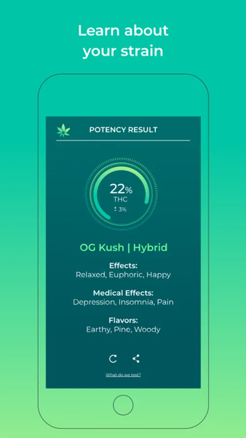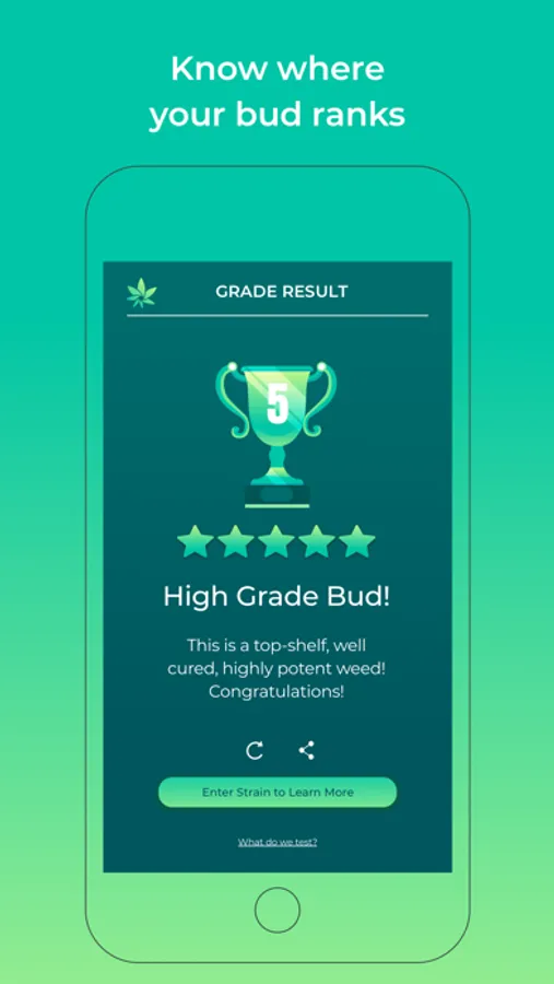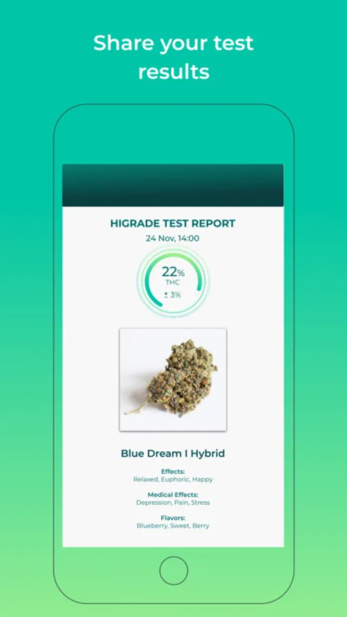 Instantly test the quality of your cannabis flowers straight from your phone. Three photos are all you need to get a real insight into the health and quality of your bud. No lab equipment is necessary! Analyze your plant’s quality and %THC by harnessing the power of artificial intelligence and HiGrade’s proprietary testing algorithms. Turn your camera phone into an accurate, portable testing station so you can better understand the product in front of you.