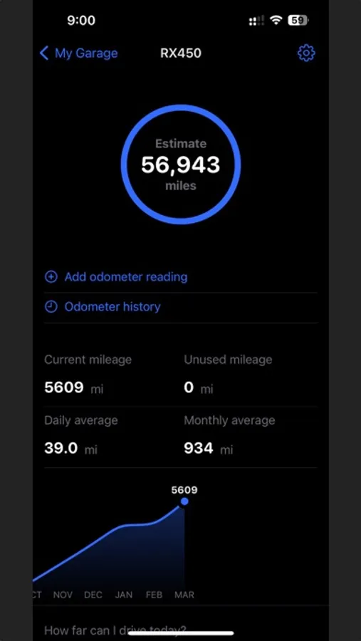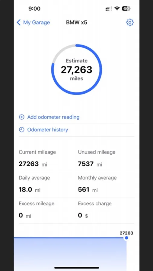 The app provides an elegant line chart to help you avoid going over mileage limit by adjusting your driving. It also shows a predicted mileage you will reach through an unique algorithm model.
