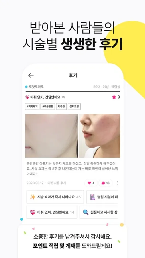 매월 3만 개씩 업데이트되는, 시술을 받아본 회원들만 작성할 수 있는 영수증 인증 후기를 확인해 보세요.