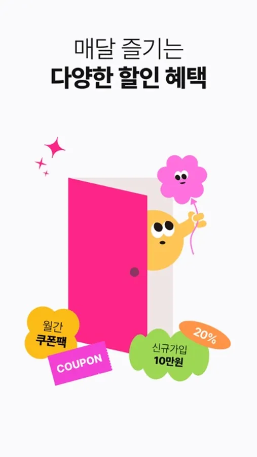 신규 회원을 위한 10만 원 웰컴 쿠폰팩부터 로그인만 해도 팡팡 터지는 다양한 회원 전용 할인 혜택을 누려보세요.