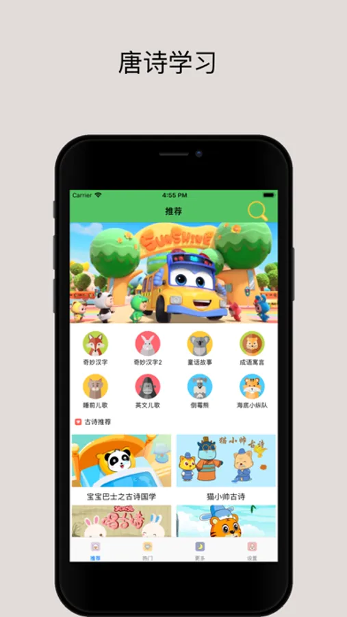 每日必看的唐诗动画,精选最耳熟能详的唐诗,配上专业美工设计的动画,让宝宝在感受快乐的同时,提升文学素养。