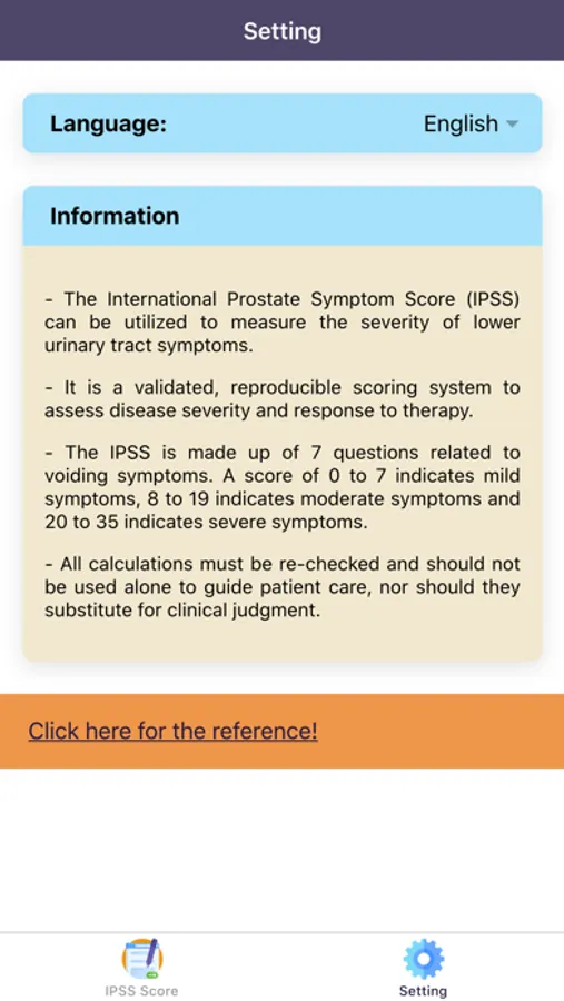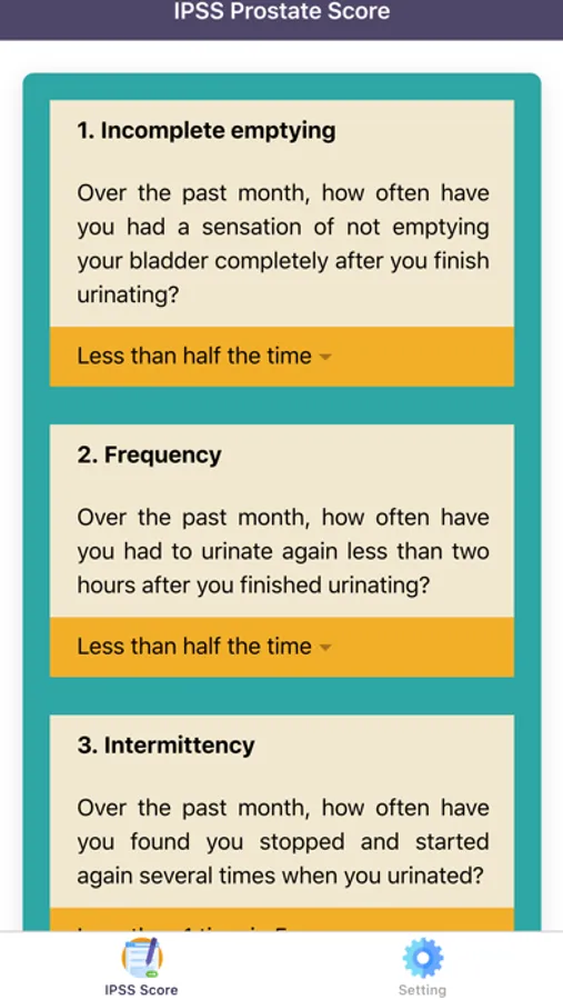 Disclaimer: all calculations must be re-checked and should not be used alone to guide patient care, nor should they substitute for clinical judgment. Calculations in this "Urology IPSS Prostate Score: BPH Symptoms Score" app might be different with your local practice. Consult to expert doctor whenever necessary.