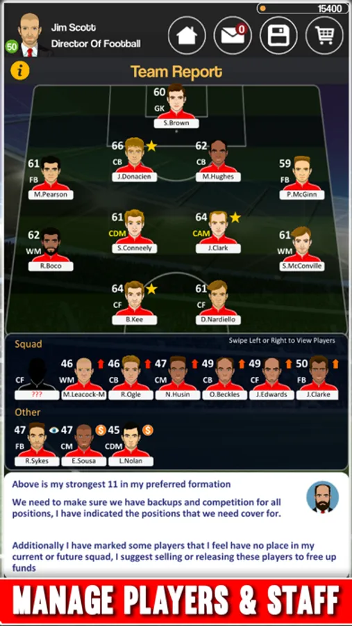 Manage every aspect of your club’s development and how you invest funds. Develop and upgrade your club's facilities, including the stadium, training ground and youth Academy. Increase revenues by negotiating sponsorships. Hire and fire your management team and build your dream squad by negotiating transfers and offers with player agents as well as handling contract negotiations with players and staff alike.