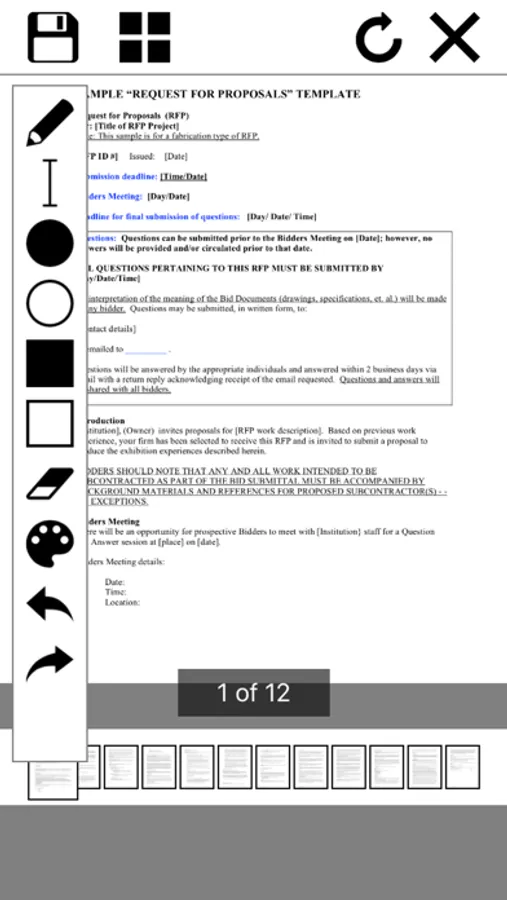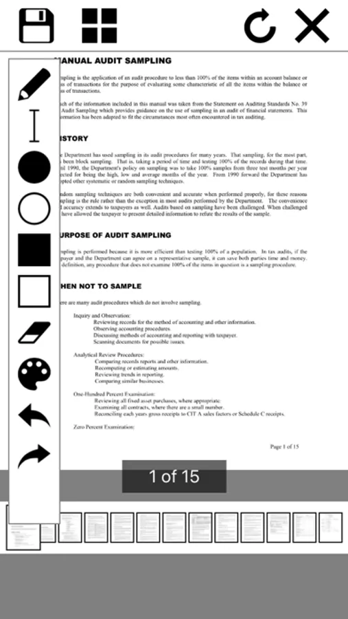 - Open and navigate any PDF file. Navigation options include thumbnails and pages.