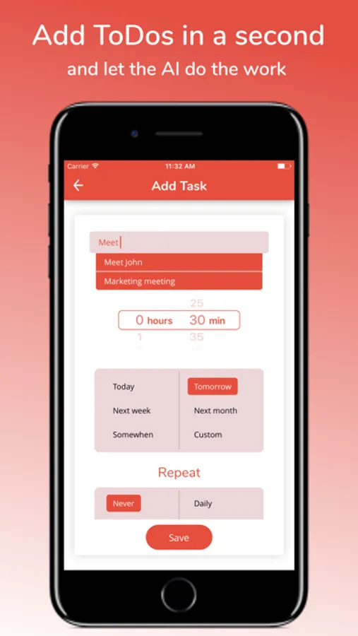 When you add tasks the AI gives you suggestions for the title, duration, and deadline. For more convenience, you can also add tasks which repeat daily, weekly or within a custom amount of days.