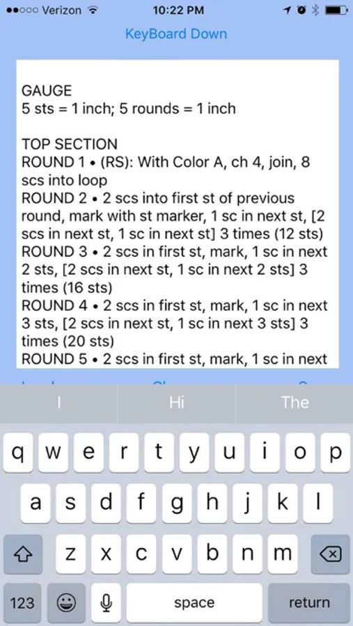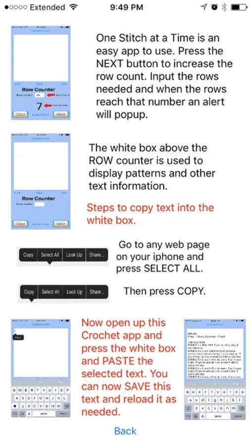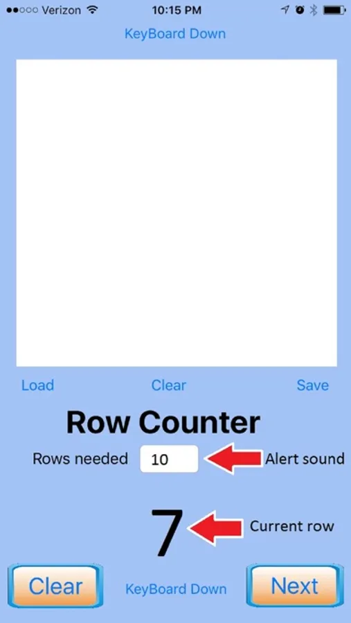 One Stitch at a Time is an easy to use app. It helps keep track of the number of rows while crocheting or knitting. You enter the number of rows that you need to complete. When the row counter reaches this number an alert will pop up and a voice will also notify you.